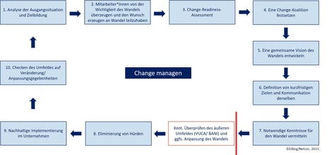 Mit einem selbst entwickelten Change Management Ansatz berücksichtigen wir sämtliche Eventualitäten und bringen Unternehmen sicher in den Wandel. Entweder in dem wir Change Agents ausbilden oder selbst den Wandel im Unternehmen begleiten. Dabei lassen wir unsere Klienten niemals alleine, sondern gehen den oftmals anspruchsvollen Weg gemeinsam. Der von Netzer, Rüth und Eßing in 2021 entwickelte Ansatz kombiniert die wirkungsvollsten Elemente gängiger Change Theorien und merzt eventuelle Schwachstellen durch die Kombination konsequent aus.